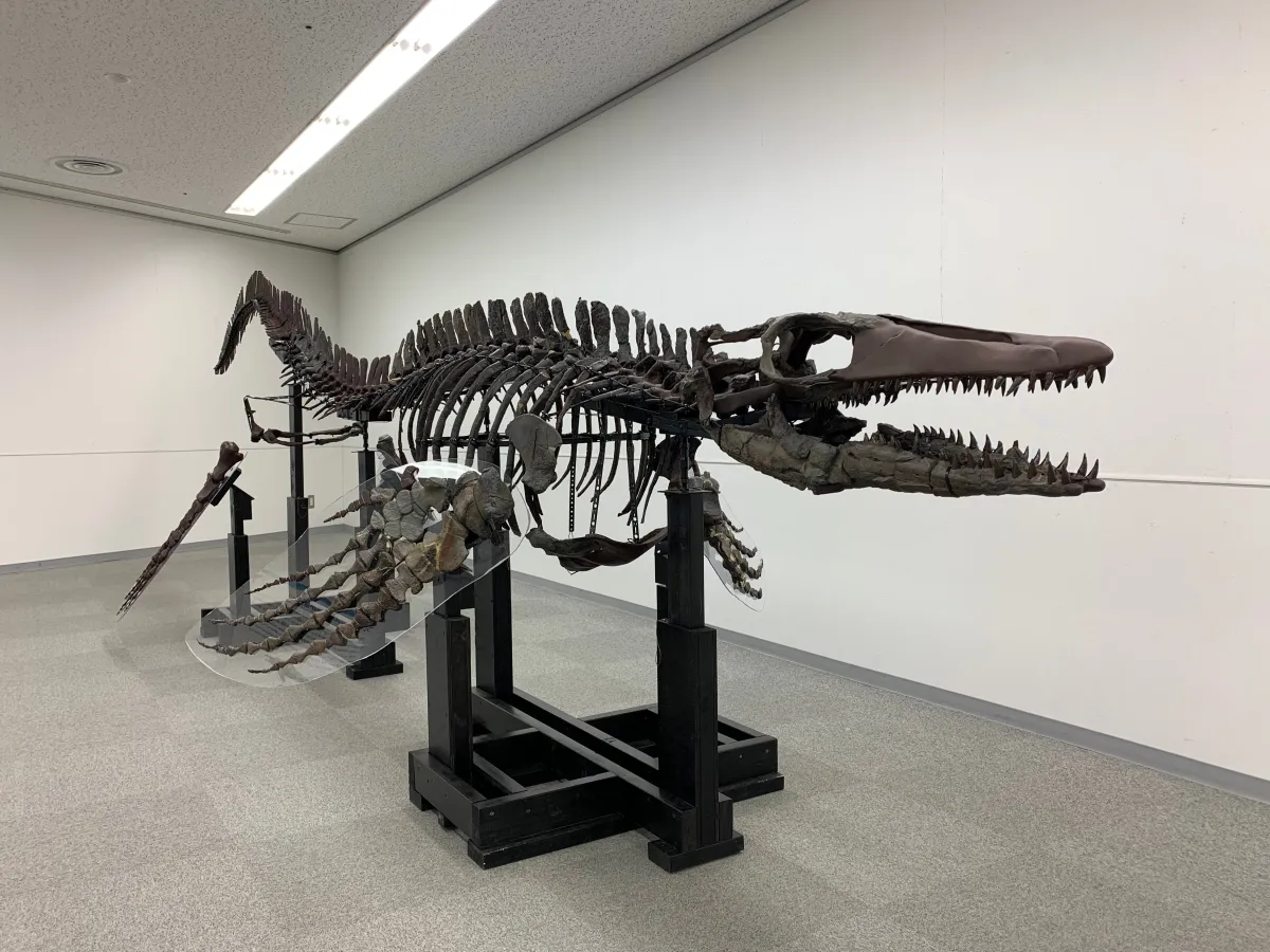 ワカヤマソウリュウは、2006年に有田川町で発見された全長約6メートルのモササウルスの一種で、アジア初の全身骨格化石として注目を集めています。この貴重な標本が、最新のロボット技術によって、その姿を現代によみがえらせることになります。展覧会では、実物大の骨格レプリカ(約6m)や生体模型(約1.2m)が展示され、来場者は古代の海を泳いでいたその姿を間近に見ることができます。